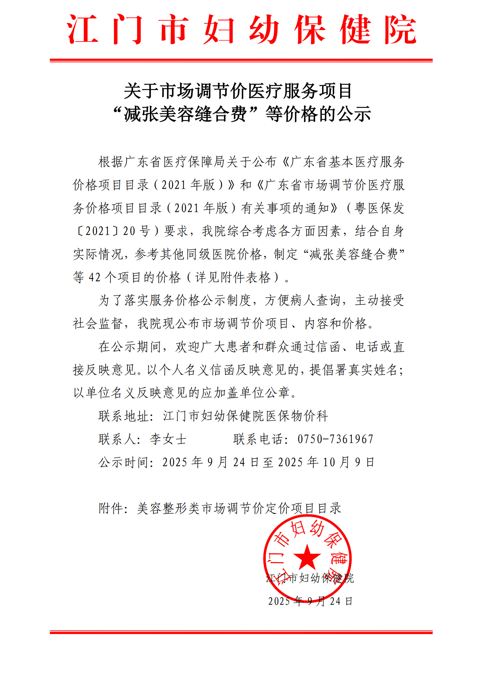 关于市场调节价医疗服务项目 “减张美容缝合费”等价格的公示