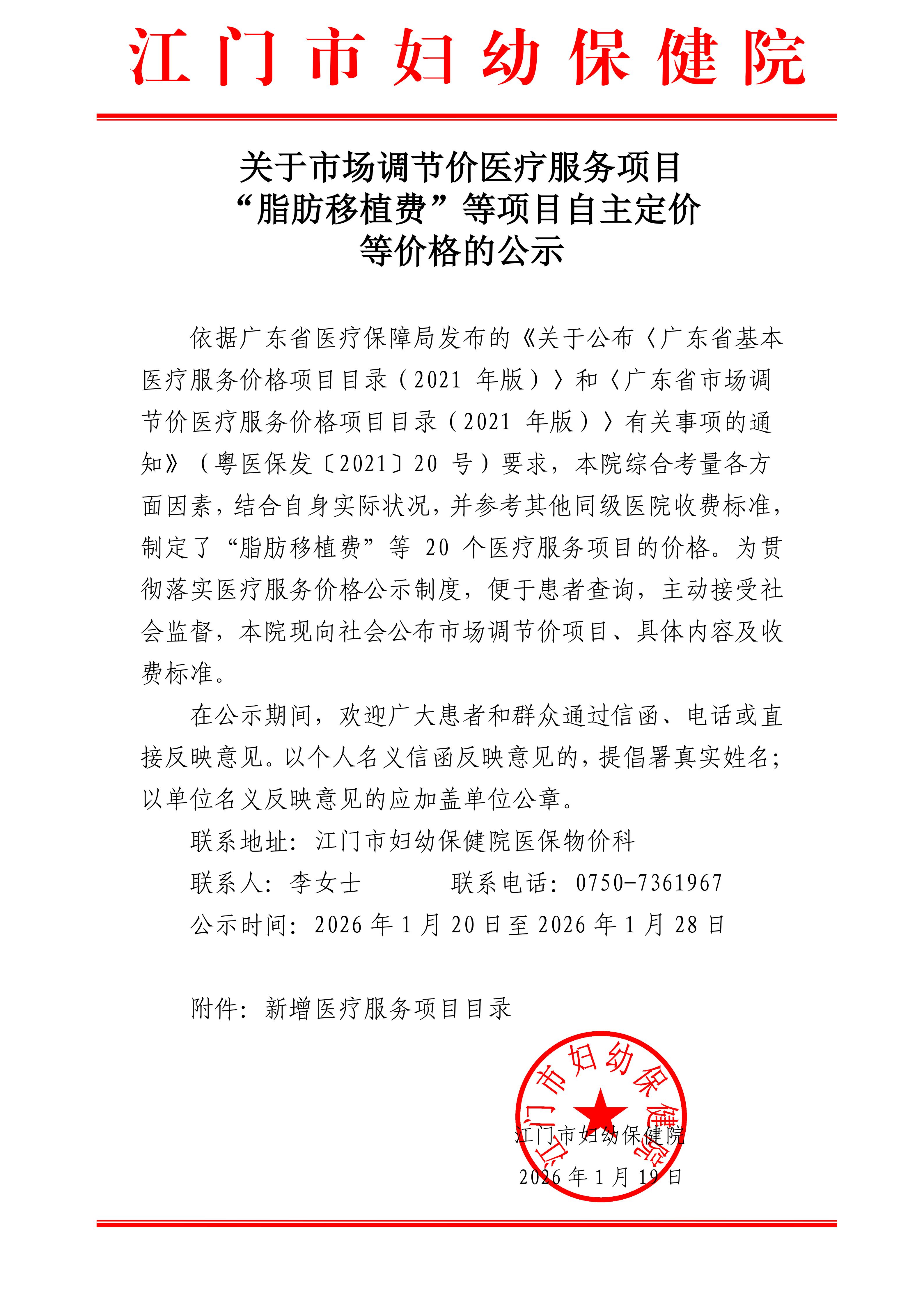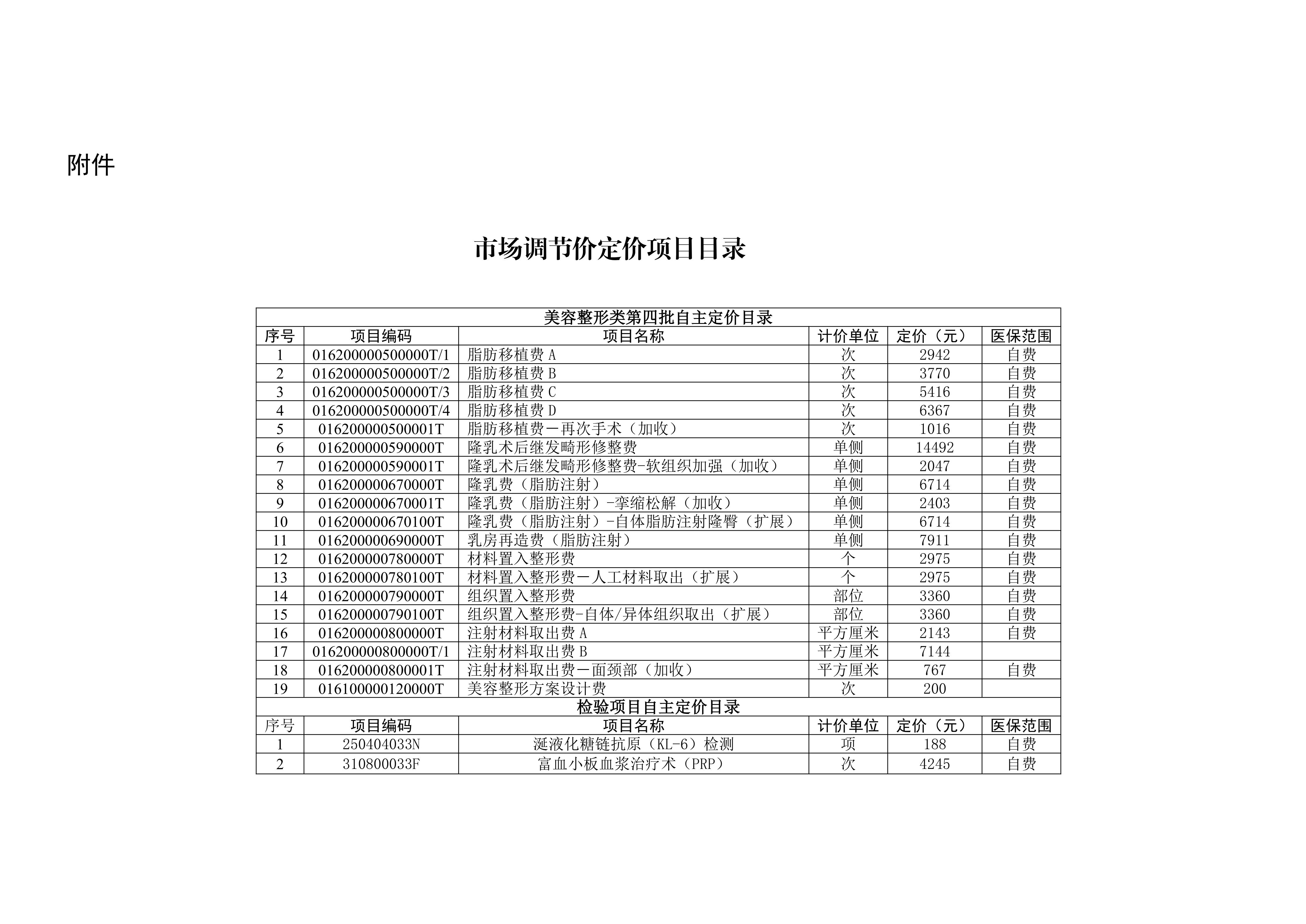 关于市场调节价医疗服务项目“脂肪移植费”等项目自主定价等价格的公示